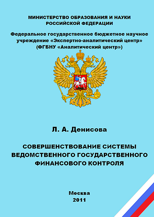 Год публикации: 2011 Денисова Л. А. Совершенствование системы ведомственного государственного финансового контроляМонография / Под науч. ред. д-ра экон. наук, проф. Э. Н. Яковлева. – М.: ФГБНУ «Аналитический центр» Минобрнауки России, 2011. – 104 с. (ISBN 978-5-904670-12-2).