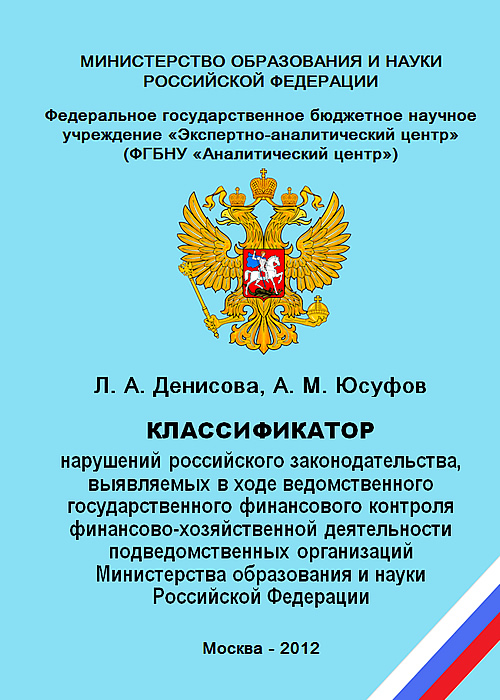 Год публикации: 2012 Денисова Л. А. Классификатор нарушений российского законодательства, выявляемых в ходе ведомственного государственного финансового контроля финансово-хозяйственной деятельности подведомственных организаций Министерства образования и науки Российской ФедерацииМонография / Л. А. Денисова, А. М. Юсуфов; под ред. д-ра экон. наук, проф. Э.Н. Яковлева. – М.: ФГБНУ «Аналитический центр» Минобрнауки России, 2012. –75 с. (ISBN 978-5-904670-17-7).
