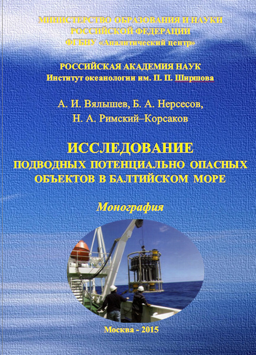 Год публикации: 2015 Вялышев А. И. Исследование подводных потенциально опасных объектов в Балтийском мореМонография / А. И. Вялышев, Б. А. Нерсесов, Н. А. Римский–Корсаков. – М.: ФГБНУ «Аналитический центр» Минобрнауки России, 2015. – 272 с.(ISBN 978-5-904670-30-6).