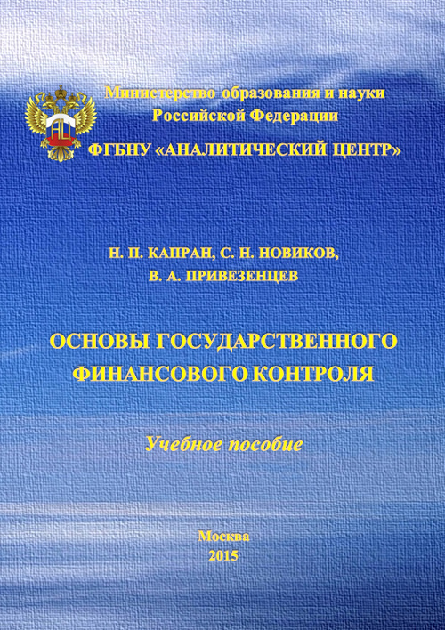 Год публикации: 2015 Капран Н. П. Основы государственного финансового контроляУчебное пособие / Н. П. Капран, С. Н. Новиков, В. А. Привезенцев; под науч. ред. д-ра экон. наук. проф. В. В. Качака. – М.: ФГБНУ «Аналитический центр» Минобрнауки России, 2015. – 76 с. (ISBN 978-5-904670-32-0).