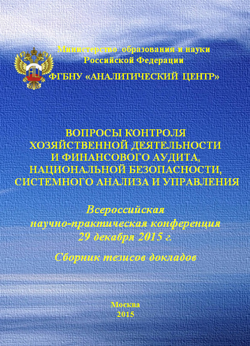 Год публикации: 2015 Вопросы контроля хозяйственной деятельности и финансового аудита, национальной безопасности, системного анализа и управленияСборник тезисов докладов Всероссийской научно-практической конференции г. Москва, 29 декабря 2015 г. – М.: ФГБНУ «Аналитический центр» Минобрнауки России, 2015. – 104 с. (ISBN 978-5-904670-33-7).
