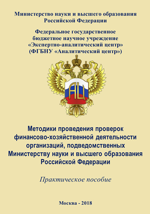 Год публикации: 2018 Бондарчук Д. В. Методики проведения проверок финансово-хозяйственной деятельности организаций, подведомственных Министерству науки и высшего образования Российской ФедерацииПрактическое пособие / Д. В. Бондарчук, С. В. Анюшин, О. А. Коробко [и др.]; под общ. ред. канд. экон. наук А. И. Володина. – М.: ФГБНУ «Аналитический центр» Минобрнауки России, 2018. – 113 с. (ISBN 978-5-904670-48-1).