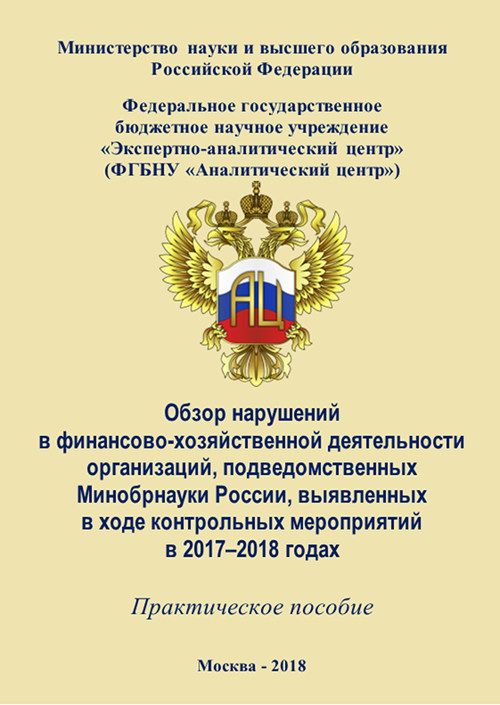 Год публикации: 2018 Бондарчук Д. В. Обзор нарушений в финансово-хозяйственной деятельности организаций, подведомственных Минобрнауки России, выявленных в ходе контрольных мероприятий в 2017–2018 годахПрактическое пособие / Д. В. Бондарчук, Л. А. Гасанбекова, Б. В. Сошников; под общ. ред. канд. экон. наук А. И. Володина. – М.: ФГБНУ «Аналитический центр» Минобрнауки России, 2018. – 64 с. (ISBN 978-5-904670-49-8).