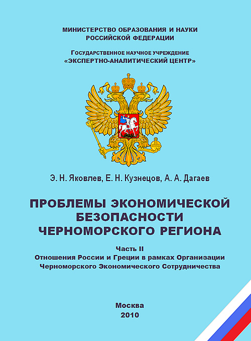 Год публикации: 2010 Яковлев Э. Н. Проблемы экономической безопасности Черноморского региона. Часть II. Отношения России и Греции в рамках Организации Черноморского Экономического СотрудничестваМонография / Э. Н. Яковлев, Е. Н. Кузнецов, А. А. Дагаев; под общ. ред. д-ра экон. наук, проф. Э. Н. Яковлева. – М.: Государственное научное учреждение «Экспертно-аналитический центр» Минобрнауки России, 2010. – 127 с. (ISBN 978-5-904670-08-5).